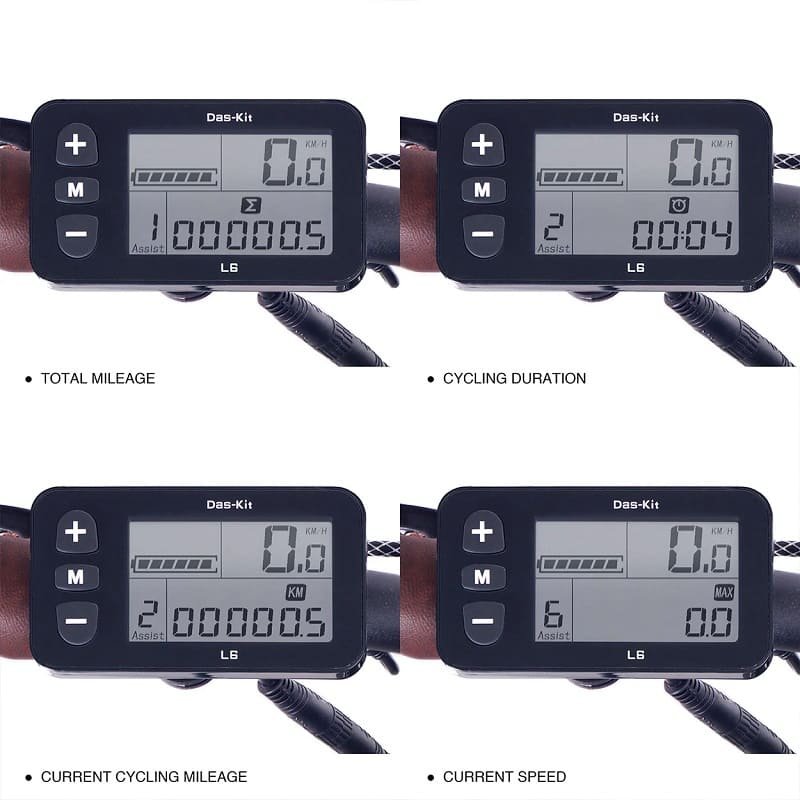 L’écran LCD Das-Kit L6B L’écran inclus avec le vélo électrique offre 6 niveaux d’assistance électrique du moteur, ainsi que diverses informations sur votre trajet.